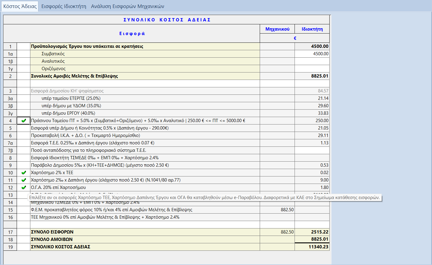 - Στην καρτέλα Εισφορές | Κόστος Άδειας, αντί του συνολικού προϋπολογισμού του έργου μεταφέρονται πλέον σε χωριστές γραμμές όπως υπολογίζονται από το πρόγραμμα ο Συμβατικός, ο Αναλυτικός και ο Οριζόμενος Προϋπολογισμός. Ο μηχανικός μπορεί να τροποποιήσει οποιονδήποτε από αυτούς και ο συνολικός προϋπολογισμός υπολογίζεται και αναγράφεται από το πρόγραμμα.