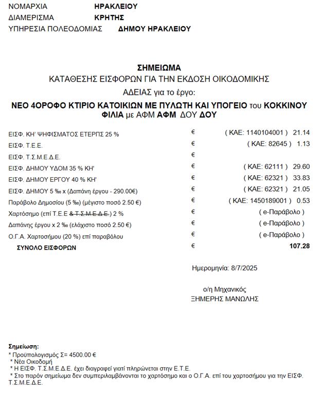 - Διόρθωση της αναγραφόμενης τιμής του προϋπολογισμού επί του οποίου υπολογίζεται η εισφορά υπέρ του δήμου με αφαίρεση ποσού 290€ όταν πρόκειται για έργο "Προσθήκη".