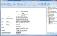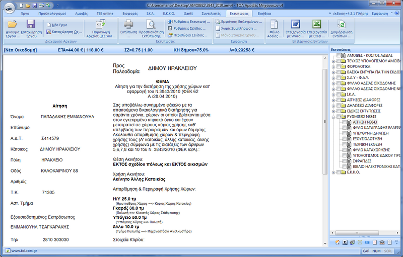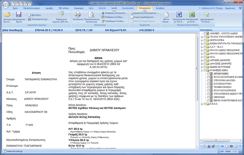 Στο φύλλο «Εκτυπώσεις» μπορούμε να βρούμε στον φάκελο «Ρυθμίσεις Ν. 3843 όλα τα απαιτούμενα έντυπα, τα περισσότερα από τα οποία συμπληρώνονται αυτόματα από το πρόγραμμα με βάσει τα στοιχεία που έχουμε καταχωρήσει. Τα ειδικά έντυπα αυτά έχουμε την δυνατότητα να τα τροποποιήσουμε ή/και να τα συμπληρώσουμε στο Word ή στο Excel επιλέγοντας τα σχετικά πλήκτρα στο πεδίο «Επεξεργασία Εντύπων» της ταινίας εντολών. |