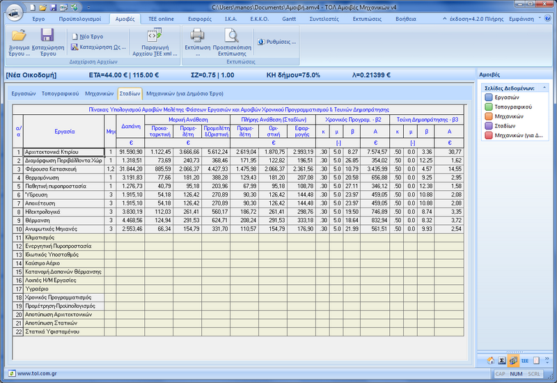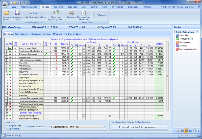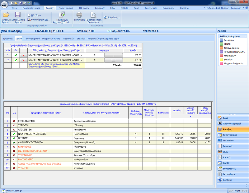 Υπολογισμός αμοιβών για μελέτες ενεργειακής απόδοσης. Χρησιμοποιώντας τους δύο διαθέσιμους πίνακες ο χρήστης μπορεί να εισάγει το είδος και το πλήθος των μελετών ΚΕΝΑΚ που επιθυμεί, να τις αναθέσει σε έναν ή περισσότερους μηχανικούς και να επιλέξει τις επιμέρους εργασίες που αντιστοιχούν σε κάθε μια μελέτη. Η αμοιβές υπολογίζονται για κάθε εργασία ξεχωριστά κι εμφανίζονται ως σύνολο στον σχετικό πίνακα δίπλα από κάθε μελέτη ενεργειακής απόδοσης.