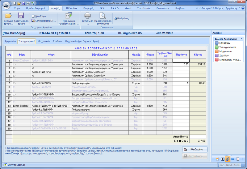 Υπολογισμό Αμοιβής Τοπογραφικών Εργασιών για την έκδοση οικοδομικών αδειών κτιριακών έργων. Καλύπτονται τα βασικά άρθρα του ΠΔ696/74 που γίνονται δεκτά στις πολεοδομίες και στο ΤΕΕ για την έκδοση οικοδομικών αδειών, αλλά και πρόσθετα άρθρα που υπάρχουν ενσωματωμένα στο πρόγραμμα ή ορίζονται από το χρήστη.